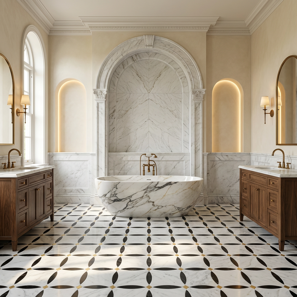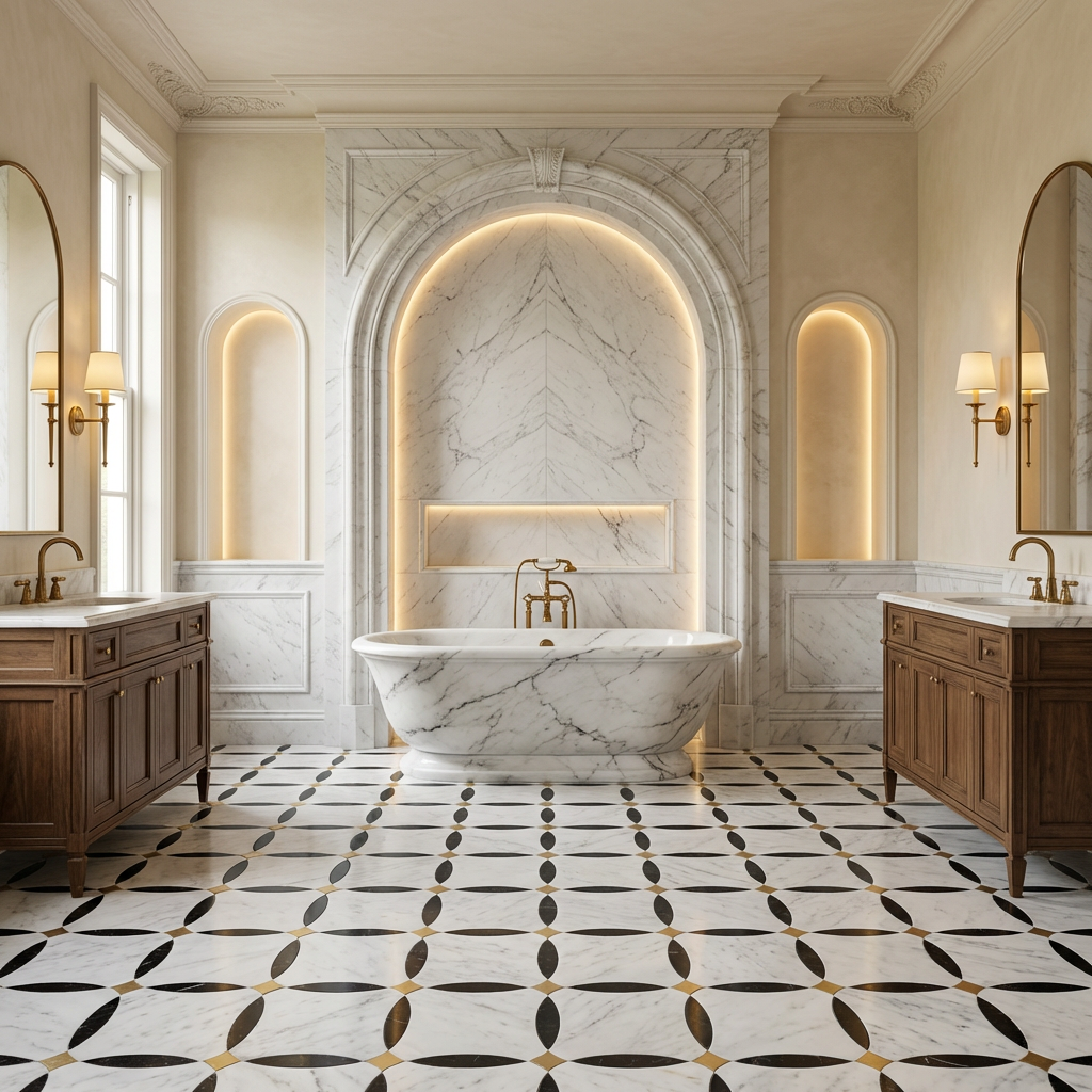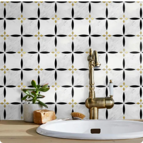 A masterpiece of luxury craftsmanship, this waterjet mosaic features premium natural white marble seamlessly integrated with Nero Marquina black accents and hand-polished brass diamond inlays. Inspired by Art Deco geometric elegance, the precision-cut elements create a rhythmic, continuous pattern that transforms walls and floors into a gallery-level display. Perfect for high-end residential and commercial projects seeking a sophisticated, jewelry-like finish.