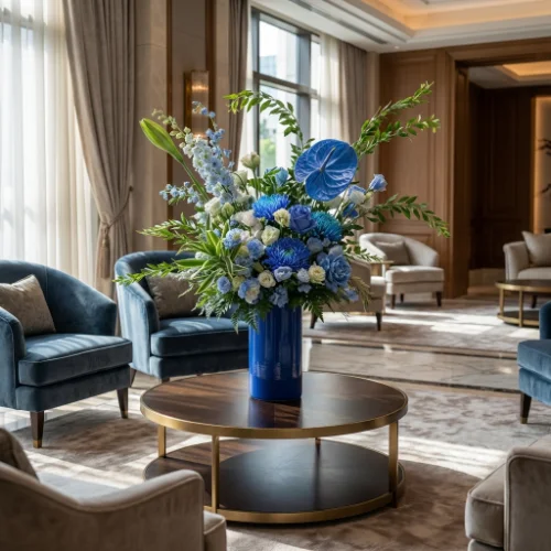 A striking blue-toned faux floral arrangement featuring Fireworks Chrysanthemum as the hero bloom, complemented by Blue Anthurium, Eustoma, Large Delphinium (Swallowtail), Rose, Lily, and accented with Handball Leaf, Fern, Small Leaf Eucalyptus, and Lily Bamboo. Designed for luxury hotel lobbies, commercial atriums, and high-end lounges.