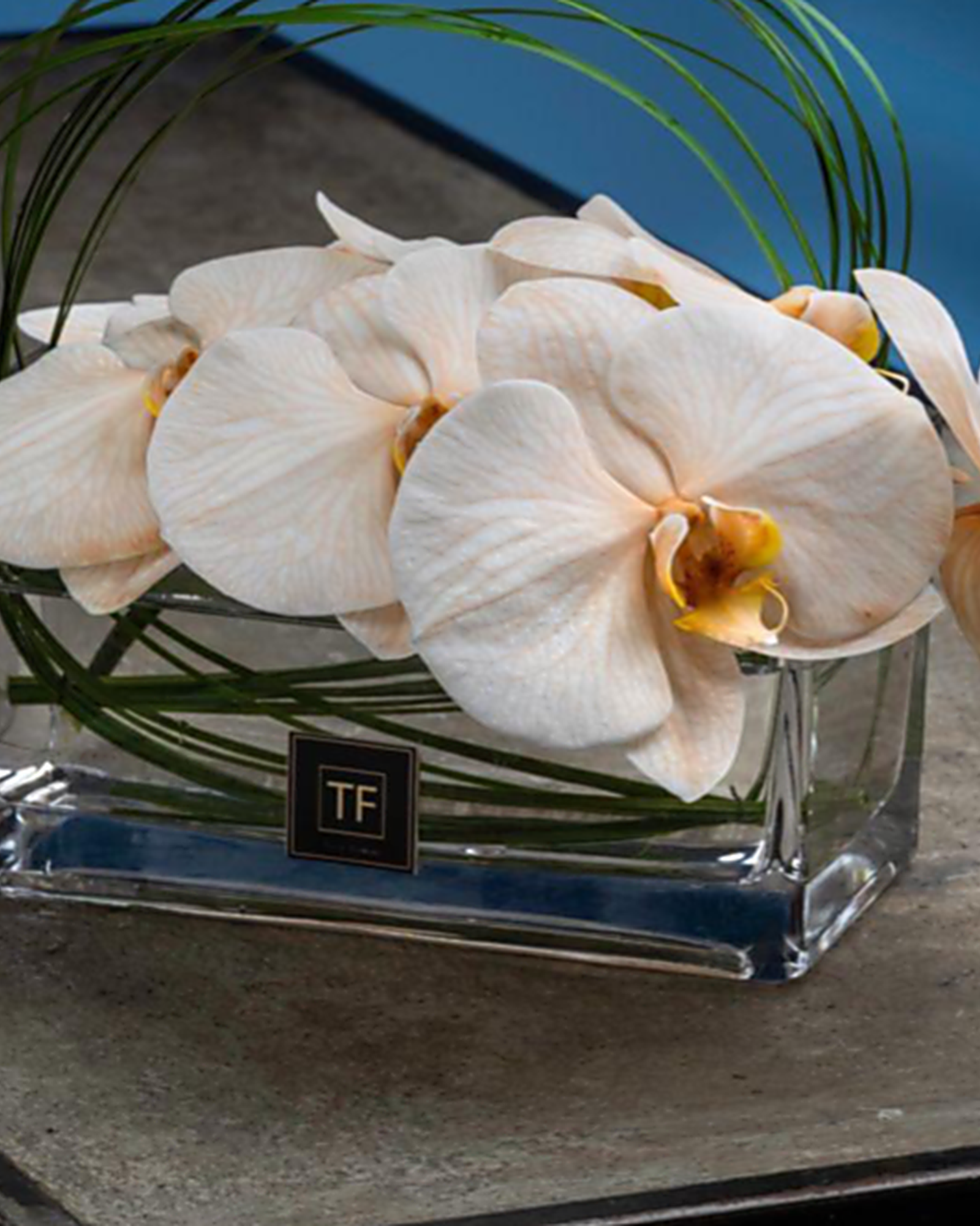 A balanced cymbidium vase arrangement with a polished look suited to entry consoles and dining settings.