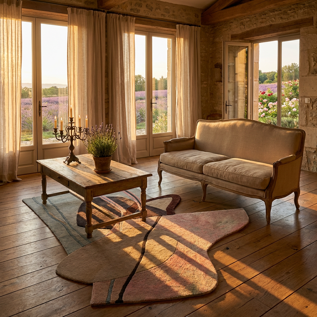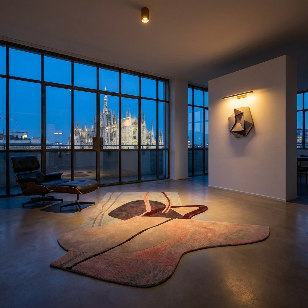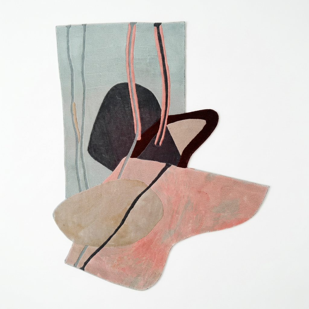 This wool rug features a unique irregular shape and an avant-garde design that breaks traditional boundaries. Inspired by contemporary abstract art, it combines soft pink-tan tones with deep charcoal and cool blue-grey, creating a sophisticated visual focal point. The premium wool material ensures a lush feel and exceptional durability.